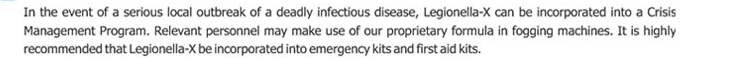 All Legionella-X products are tested by reputable third party laboratories and issued with North Atlantic Treaty Organization (NATO) Master Cross-Reference List Stock Numbers. Legionella-X products do not contain triclosan, an anti-biotic chlorophenol and pesticide commonly found in anti-bacterial soaps and cleaners and which is molecularly similar to some of the most toxic chemicals.